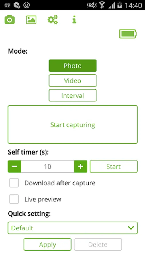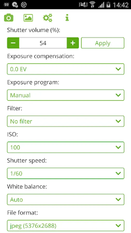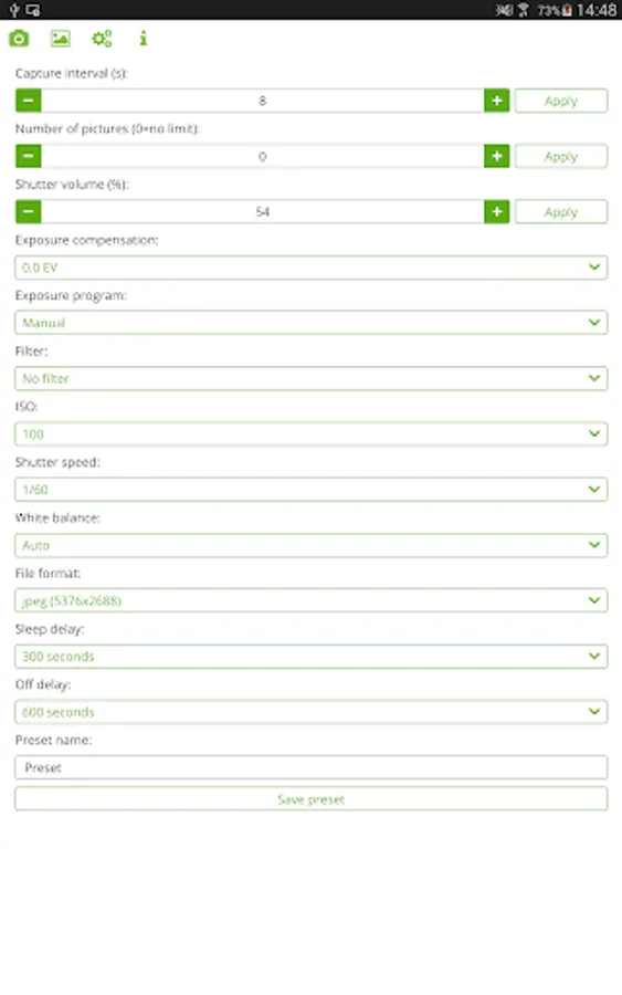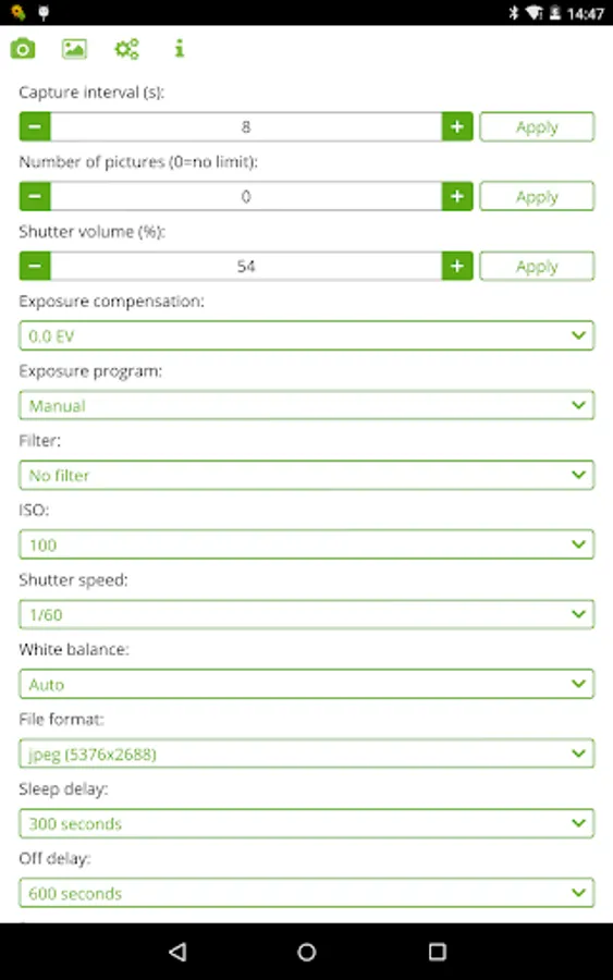 - Change all settings (shutter time, exposure compensation, white balance, ISO, power off and standby delays, filters, hdr filter, noise reduction filter, ...).