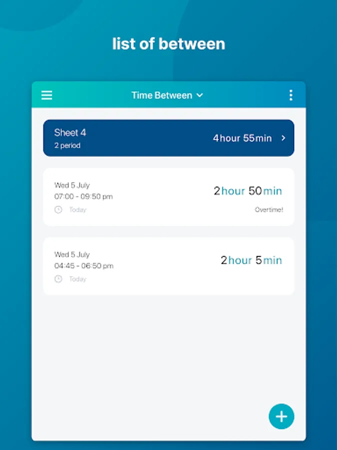 #2 - Time Between: list of period time for your hour work (like TimeSheet)