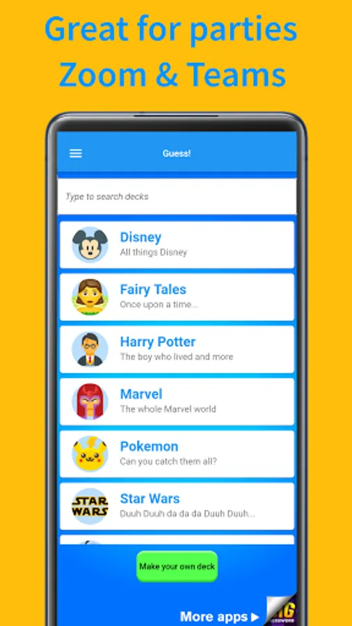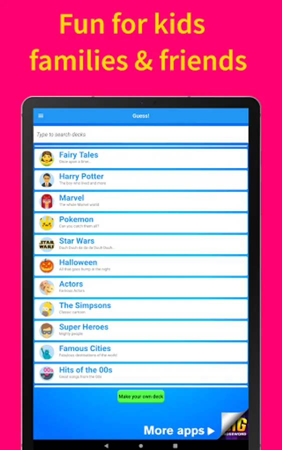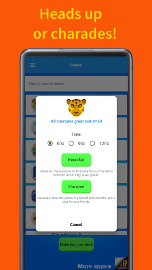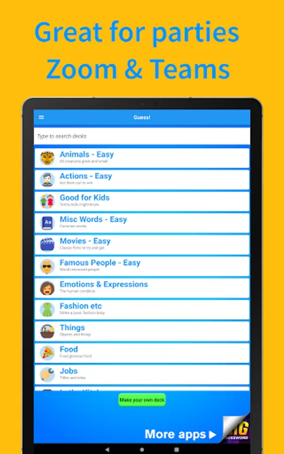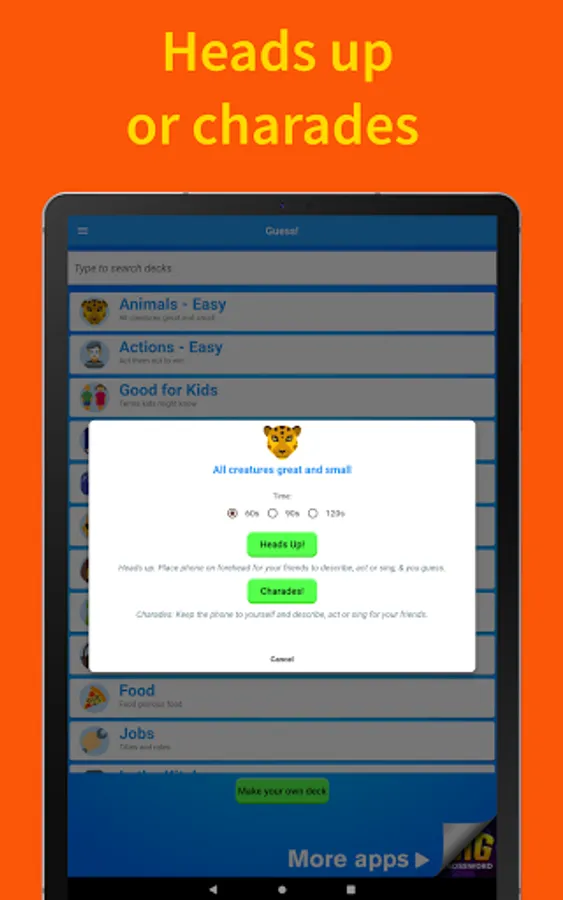 - Charades Mode - keep the word to yourself. Other players must guess the word you describe, mime and act.