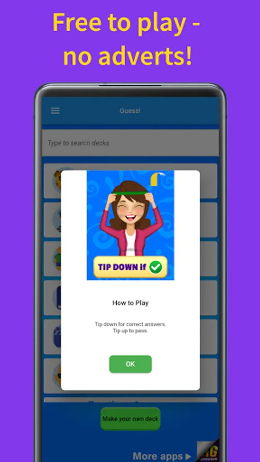 - Heads Up Mode - place phone on your forehead. Other players try and tell you what the word is. Tip down for correct answers, tip up to pass on the word.