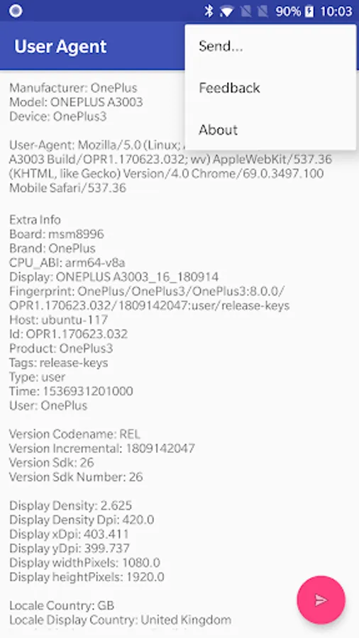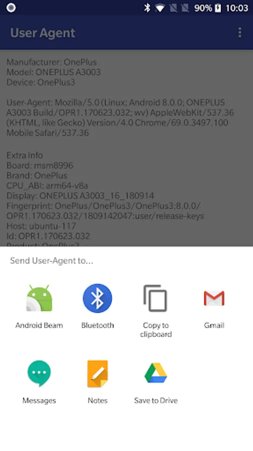 Displays the browser User-Agent and other useful device info. Data can be shared by email, text, etc.