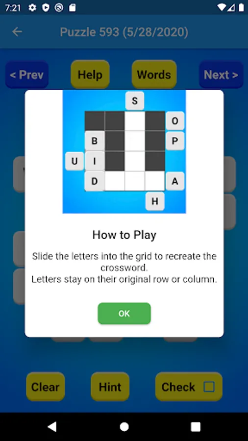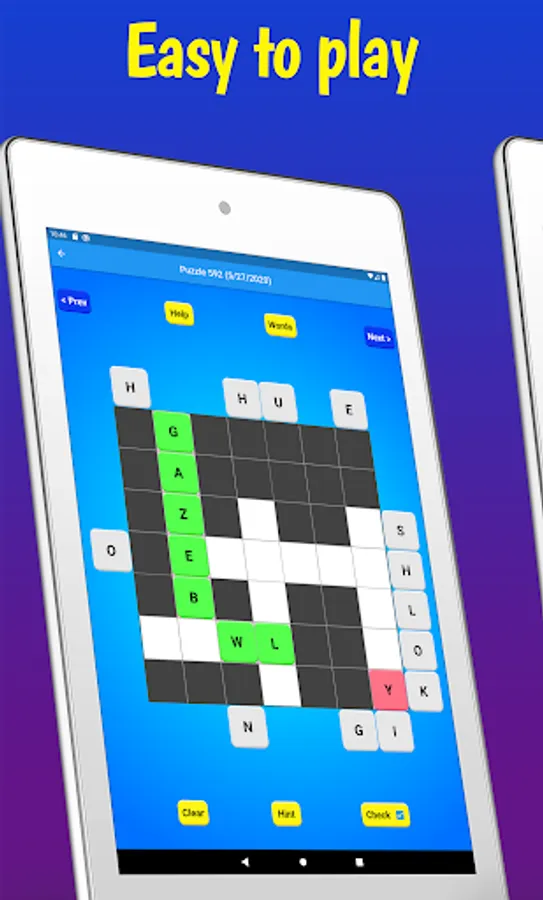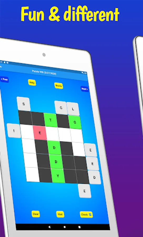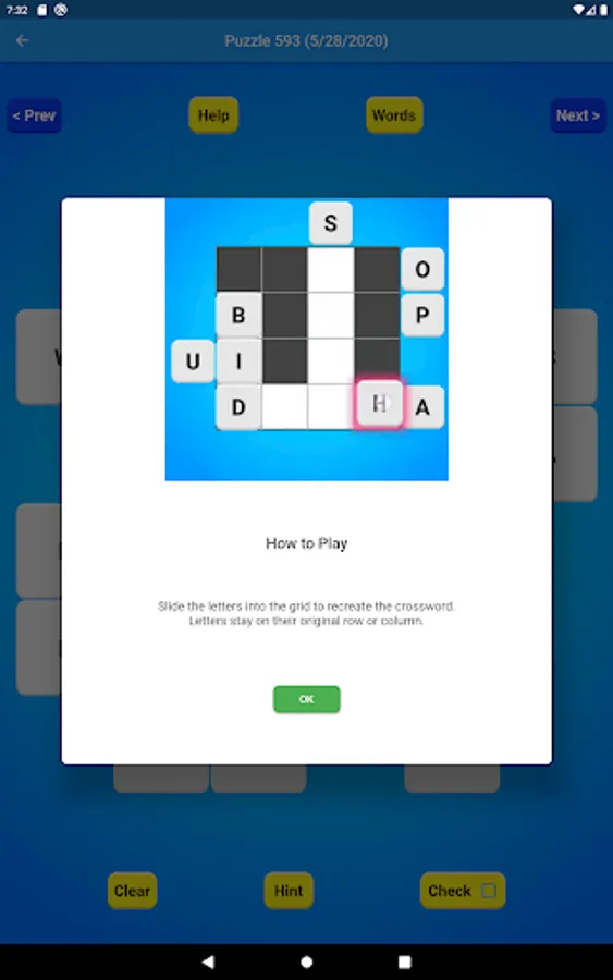 Tap 'Check' to see how you're doing. If you need help, press 'Hint' to place a random letter.