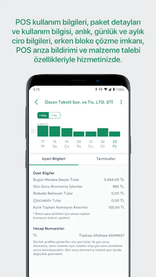 You can manage and track your POS devices with merchant functions like ,realtime turnover and blocked and released amount, 7 day/7 month turnover trend, sharing monthly statements, requesting POS materials, open a ticket for a problem.