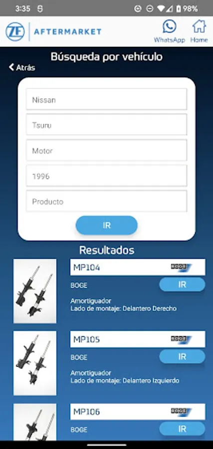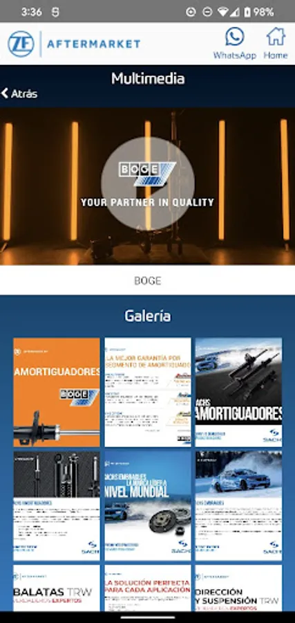 In this application you can find the catalog of the products of the BOGE Shock Absorbers brands. TRW Balatas. TRW Shock Absorbers. TRW Suspension and Steering Parts. SACHS Clutches. SACHS Shock absorbers.