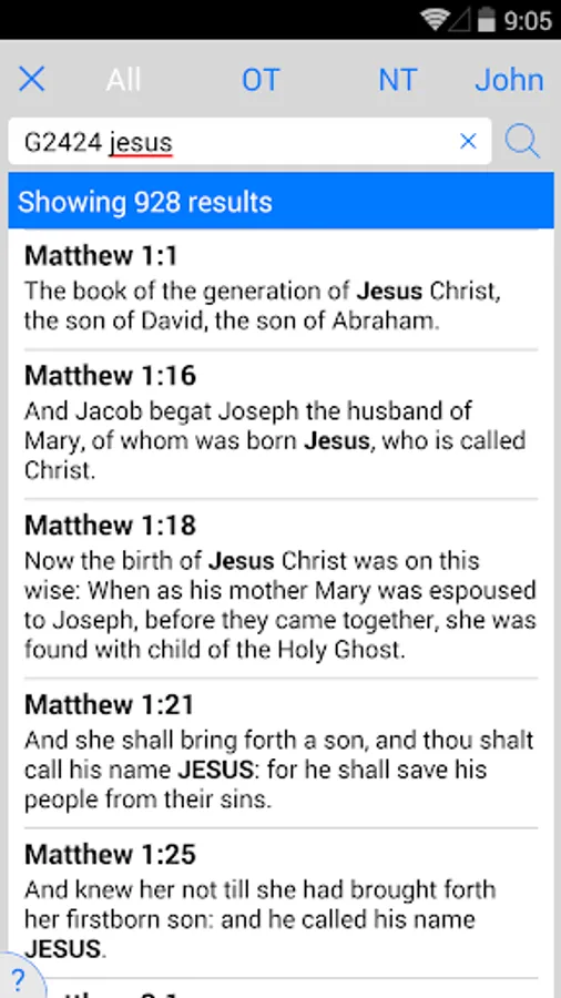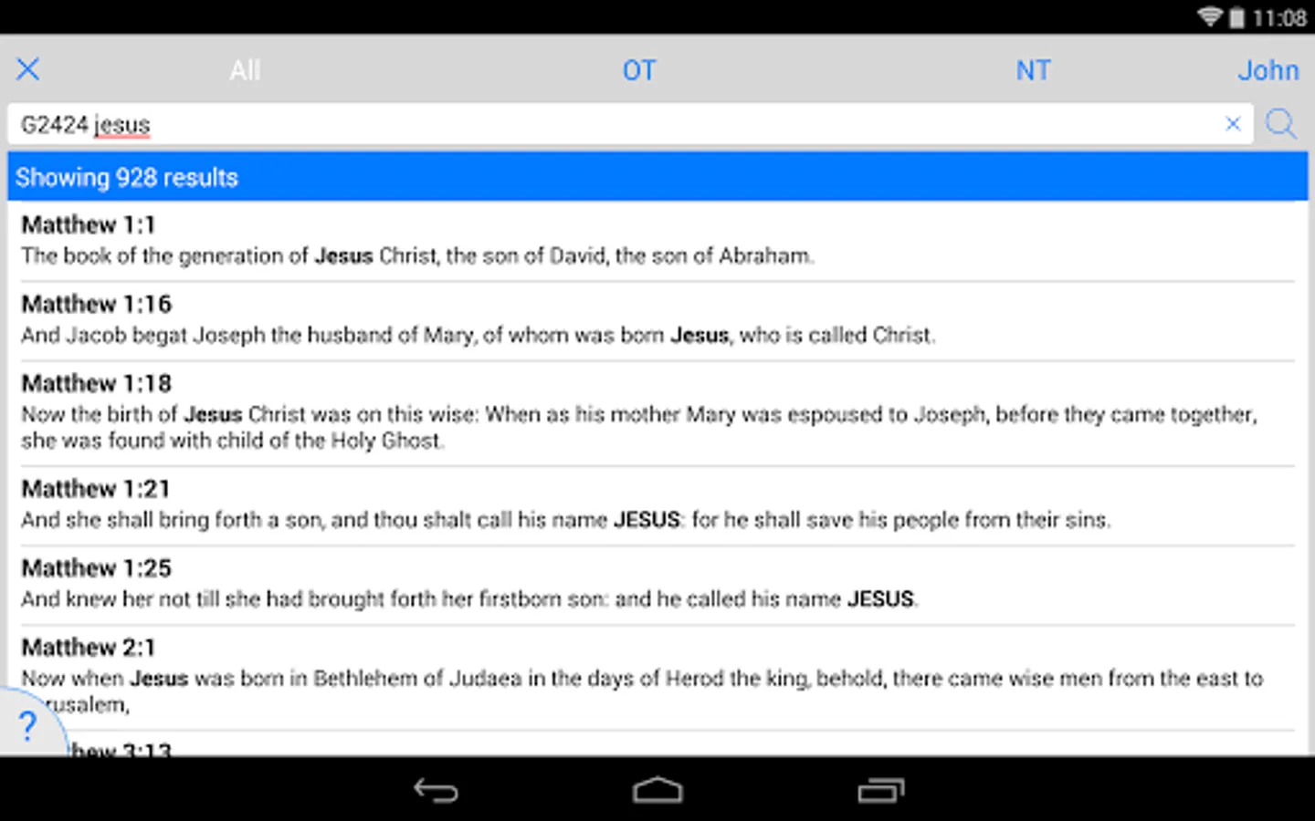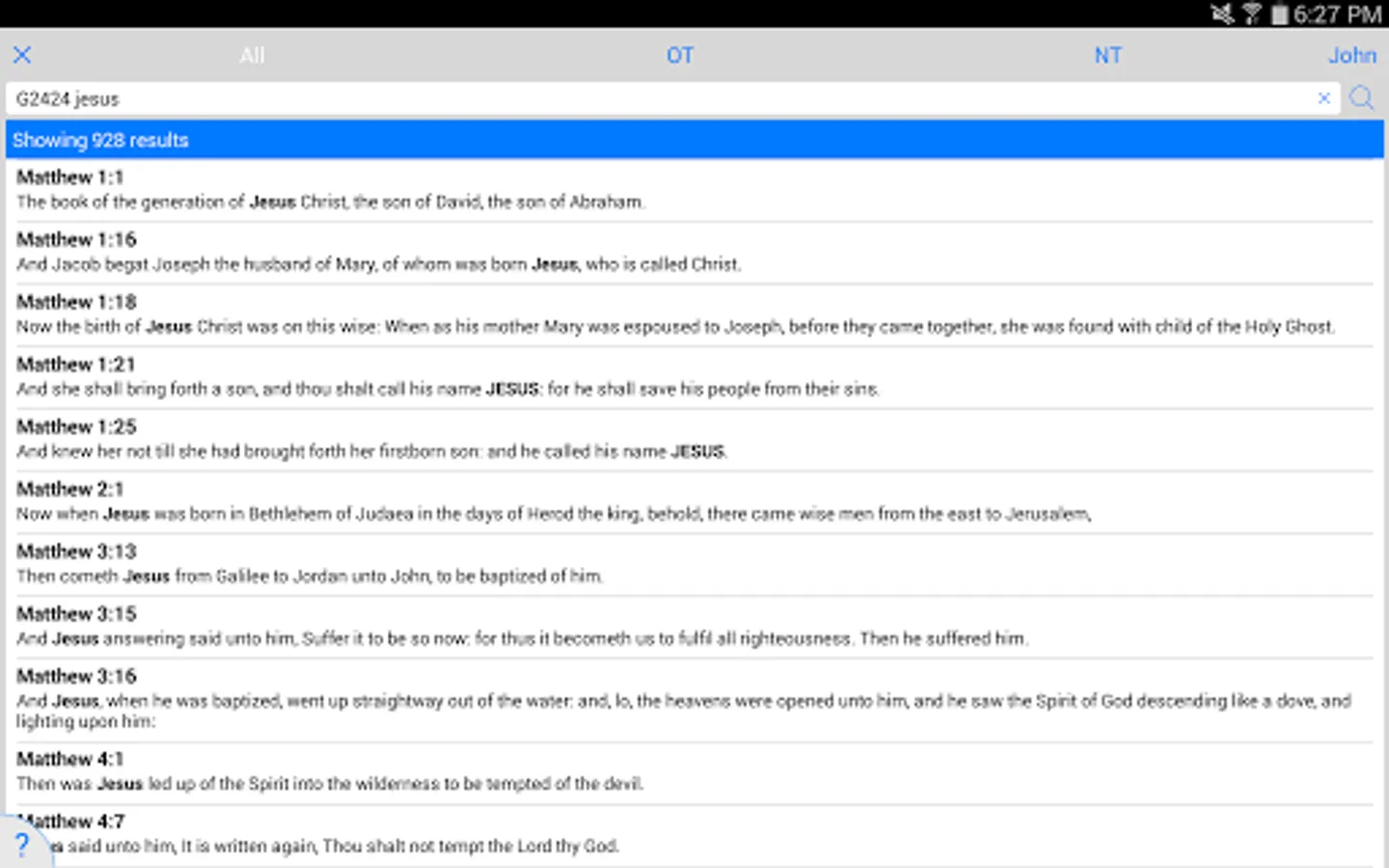 Find every occurrence of any word in the King James Version Bible. Only the words not likely to be used in locating a passage have been eliminated (words such as should, those, and when) or condensed to include only the important occurrences (words such as bring, day, and might).