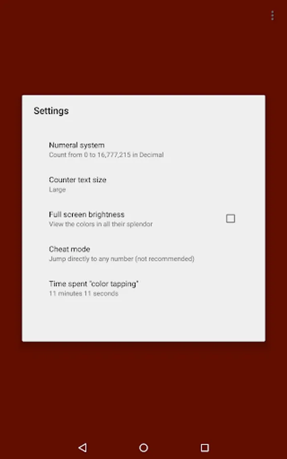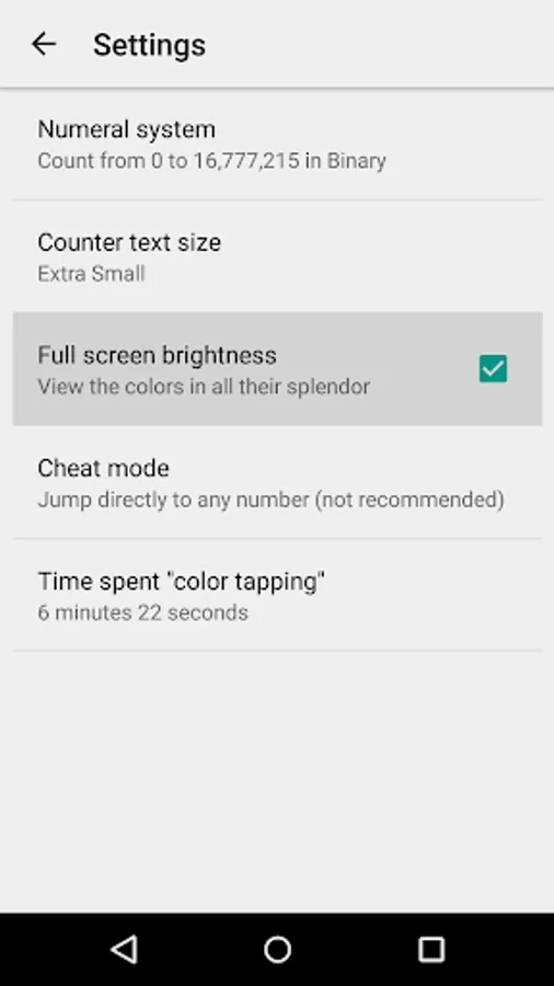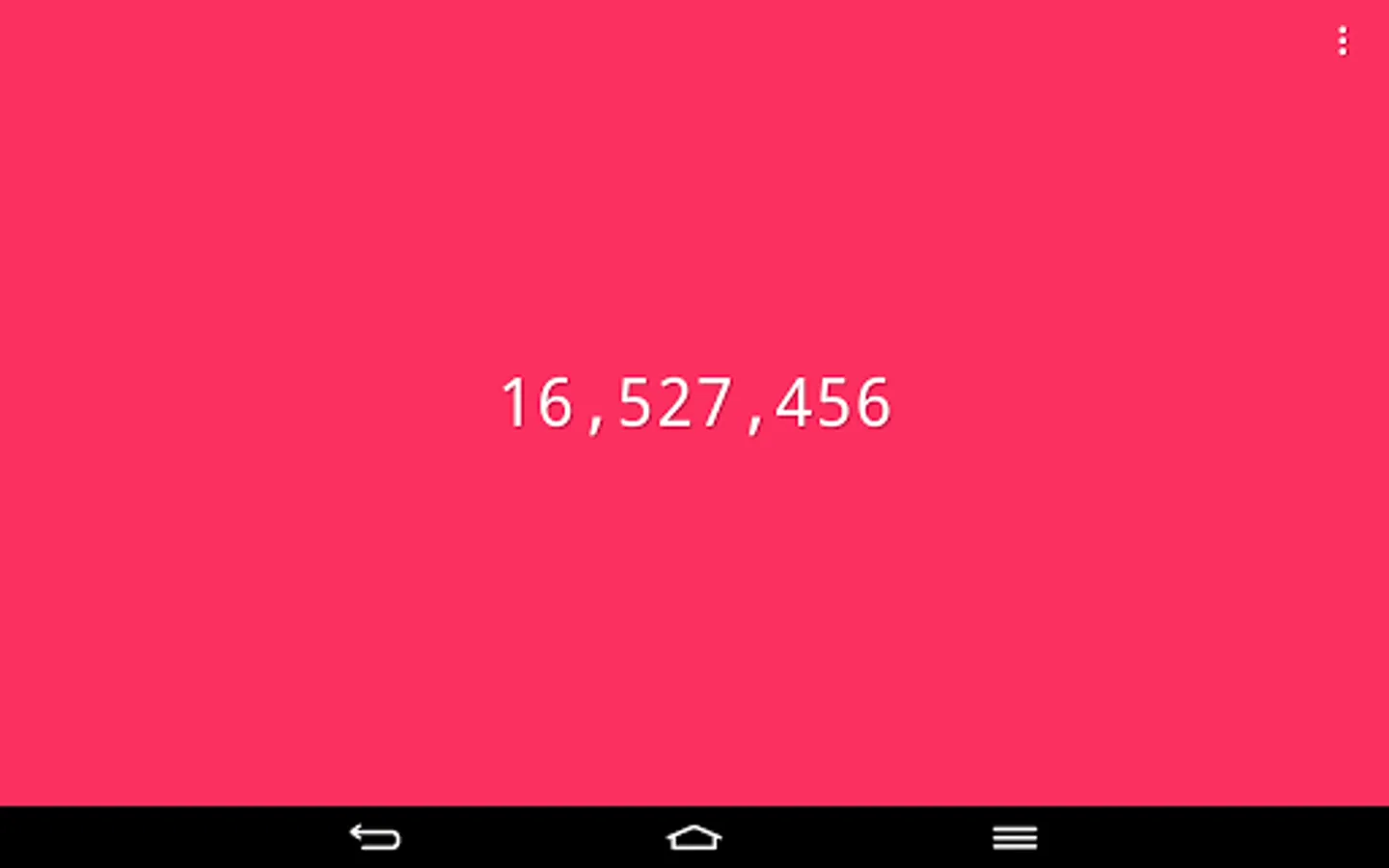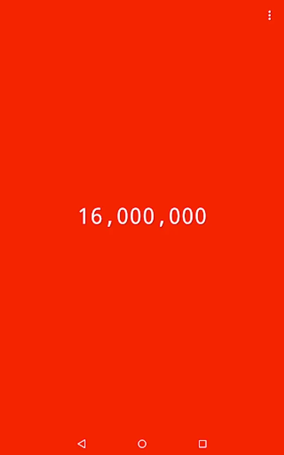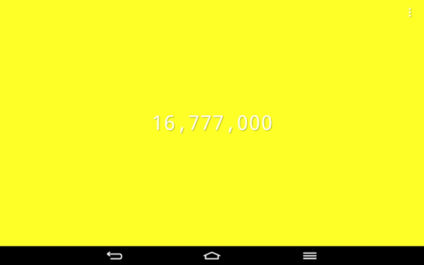 Tap Color Mantra is an app that counts your taps on your phone or tablet. With each touch the screen is filled with a different tint of color, whose RGB color code equals the number of taps so far. 0 is Black, 255 is Blue, 65,280 is Green, and 16,777,216 is White.