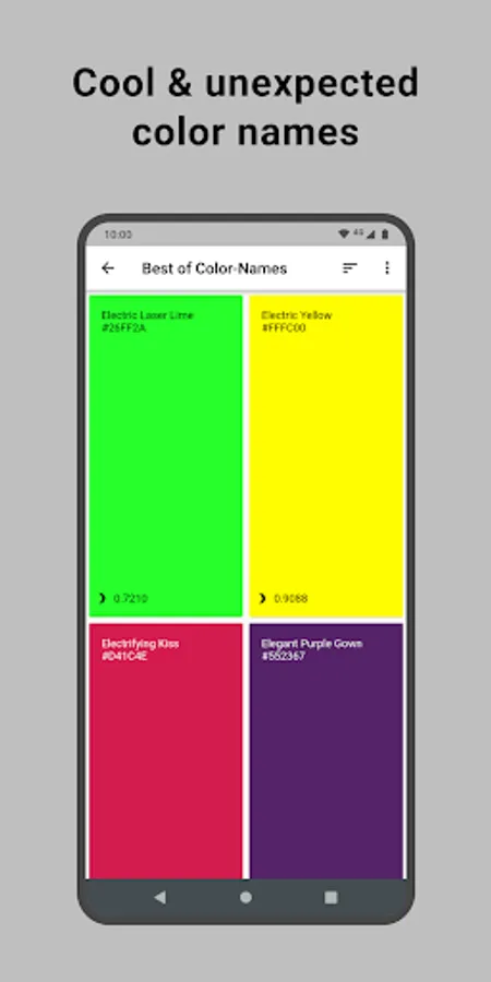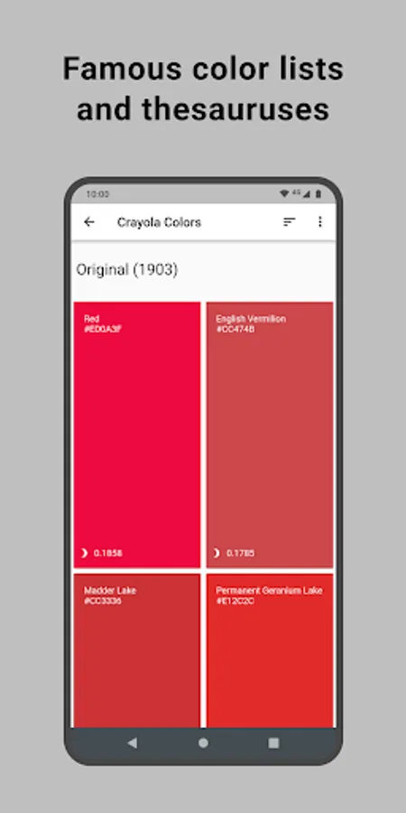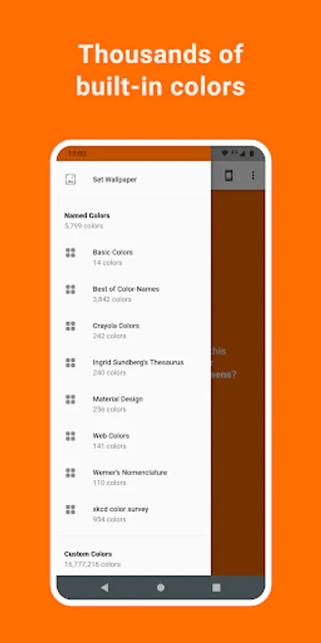 You can select between thousands of built-in colors: basic colors (Red, Green, Blue, Magenta), web colors (Hot Pink, Gold, Chocolate, Royal Blue, Misty Rose), Material Design colors (Deep Purple 900, Indigo 700, Amber 100, Blue Grey 400), Werner's Nomenclature of Colors (Snow White, Blackish Grey, Scotch Blue, Imperial Purple, Emerald Green), and thousands more handpicked colors.