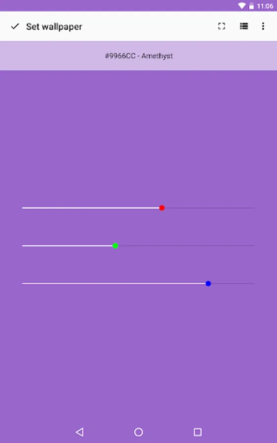 Simply drag the 3 seek bars to blend red, green and blue and create your own unique and beautiful color. Then tap a button to set your creation as your amazing minimalist color wallpaper. That's it.