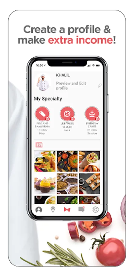 If you are a cook, you can create a user profile and show your talents by uploading photos about your master work. List your specialties and specify your price.