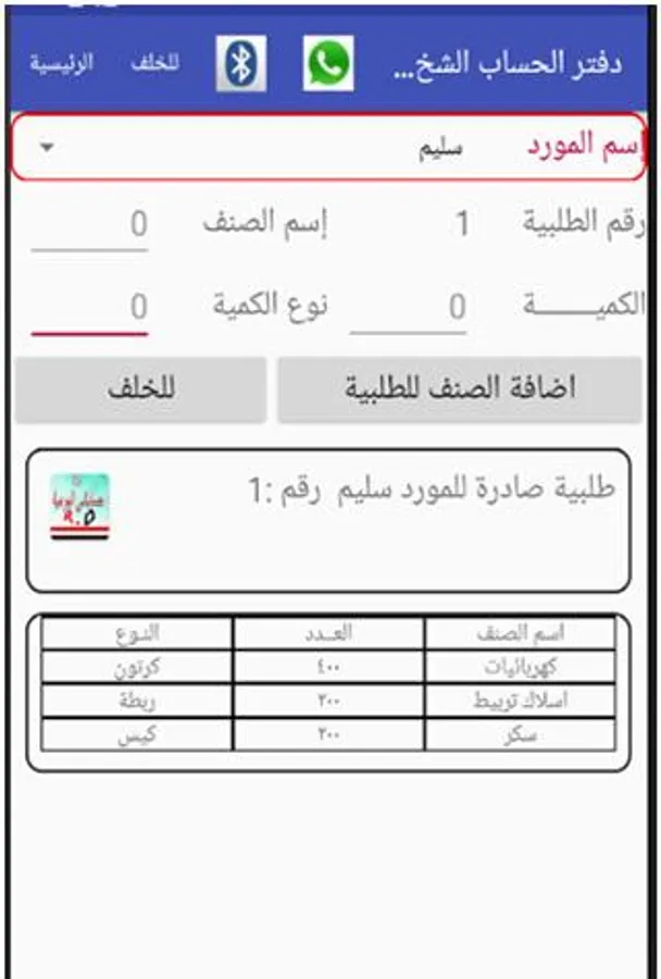 The order of the goods shall be registered and the type, quantity and name of the goods shall be recorded and sent to the supplier directly from the application via Bluetooth or Bluetooth.