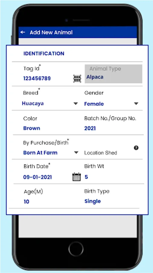 • Identification – Tag ID is unique key is used to capture information about each animal. Identification section allows to store information about animal based on born at farm, purchased outside, gender, color, batch and location / section or compartment of animal house.