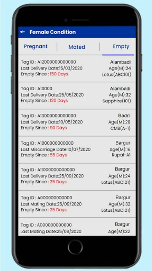 • Female animal progress – App helps to report female animal progress based on age, mating status, pregnancy status, kids delivery date and propose next pregnancy schedule.