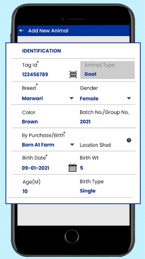 • Identification – Tag ID is unique key is used to capture information about each animal. Identification section allows to store information about animal based on born at farm, purchased outside, gender, color, batch and location / section or compartment of animal house.