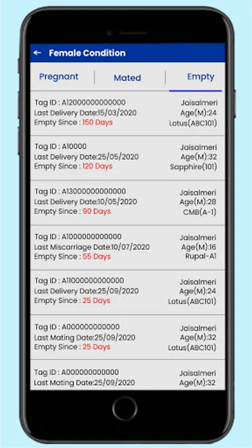 • Female animal progress – App helps to report female animal progress based on age, mating status, pregnancy status, kids delivery date and propose next pregnancy schedule.