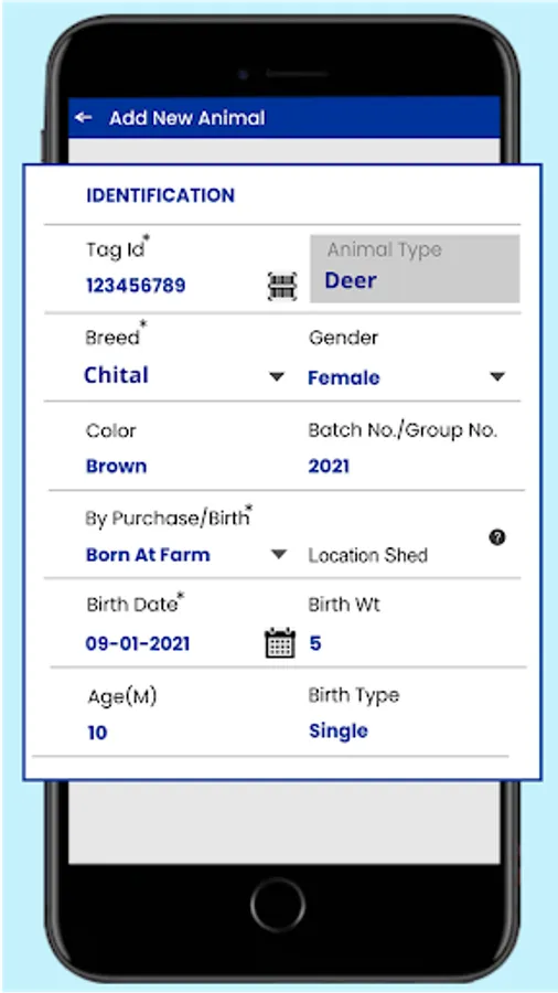• Identification – Tag ID is unique key is used to capture information about each animal. Identification section allows to store information about animal based on born at farm, purchased outside, gender, color, batch and location / section or compartment of animal house.