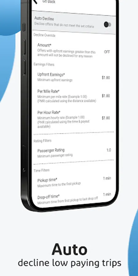 Maxymo allows you to set custom filters for auto declining trips or delivery orders, so you only accept the profitable ones.