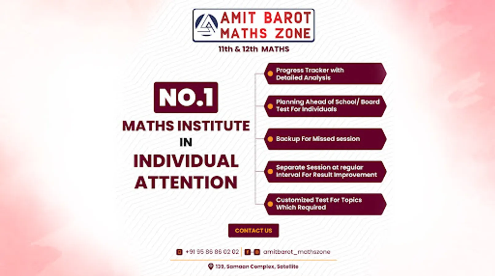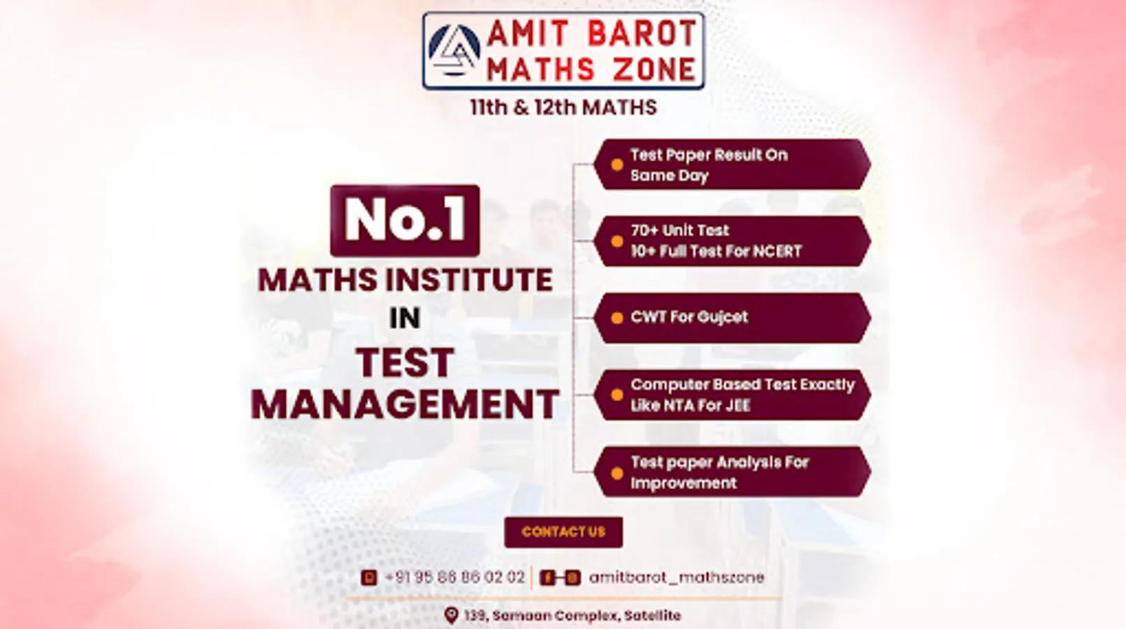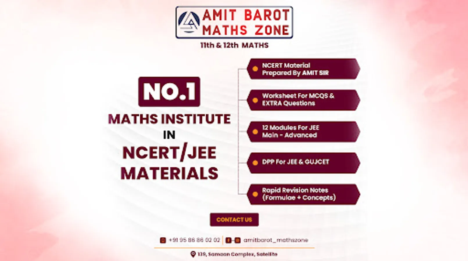 “AMIT BAROT MATHS ZONE” - Premier Math’s Institute for 11-12 MATHS, was established in Ahmedabad with a vision to provide best coaching for NCERT + JEE. Amit Sir starts any topic with basic level of NCERT and extends it to JEE Advanced level.