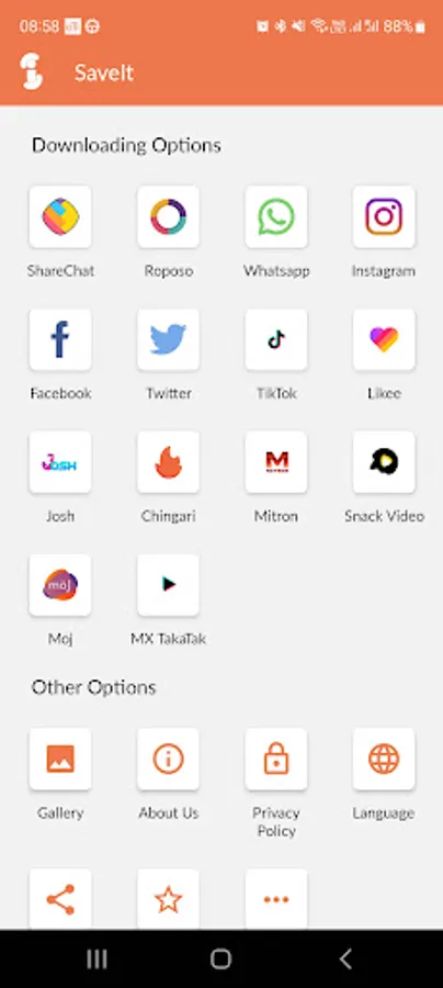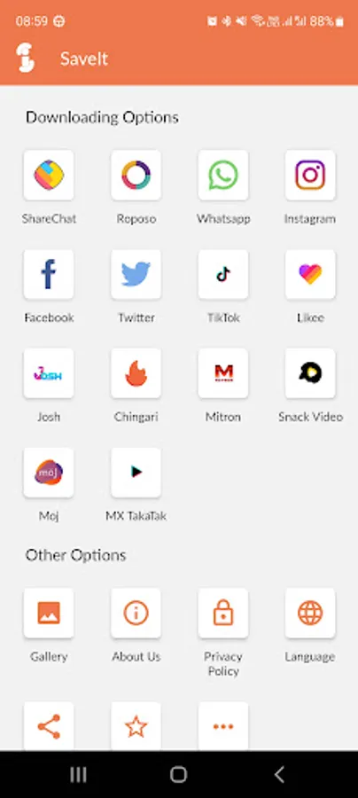 Introducing Save It Social Media Downloader, the ultimate app for downloading and saving social media posts and statuses from a wide range of popular platforms. With support for Facebook, Instagram, TikTok, Twitter, Likee, Chingari, Snack Video, MX Takatak, Josh, Moj, ShareChat, Roposo, and many more, this app is your all-in-one solution for accessing and preserving your favorite social media content.