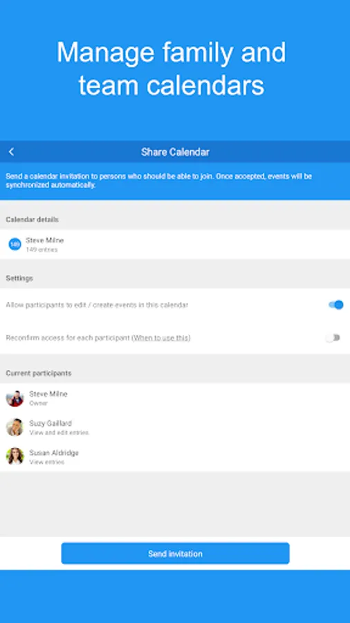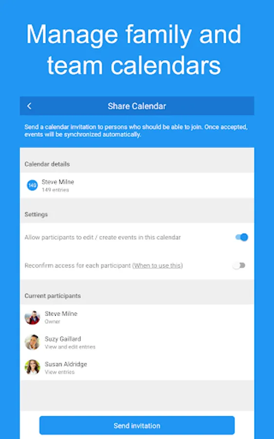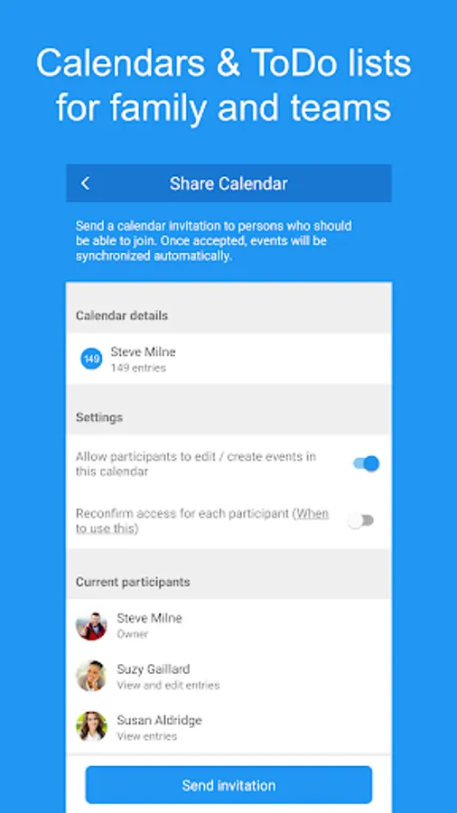 • Use calendars and ToDo lists together with family, friends or team – easy, fast, and reliably.
