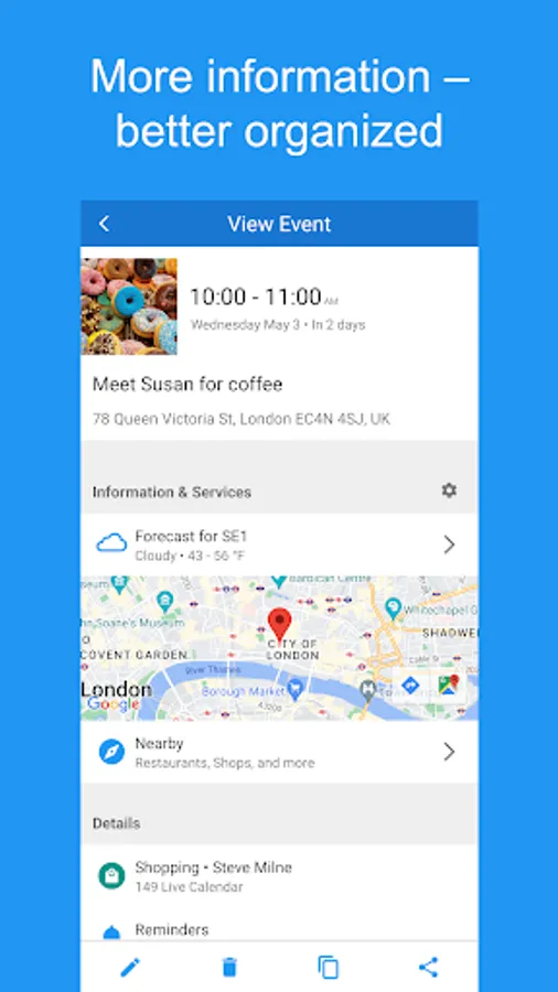 • Perfect when on the move: Get maps, local weather at your destinations, and top places nearby – 149 Live Calendar places your events in real-world context and enriches them with up-to-date data, giving you additional valuable information to each of your events.