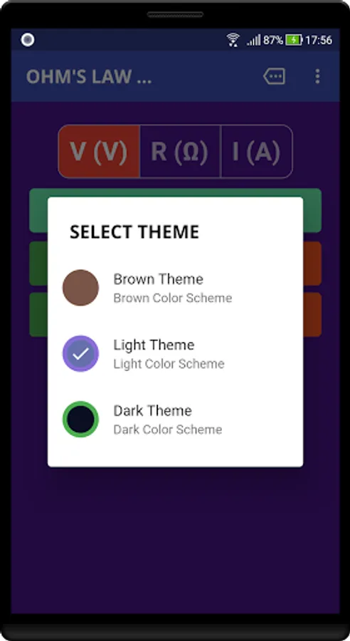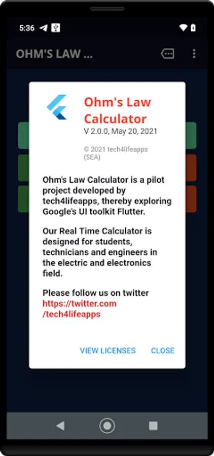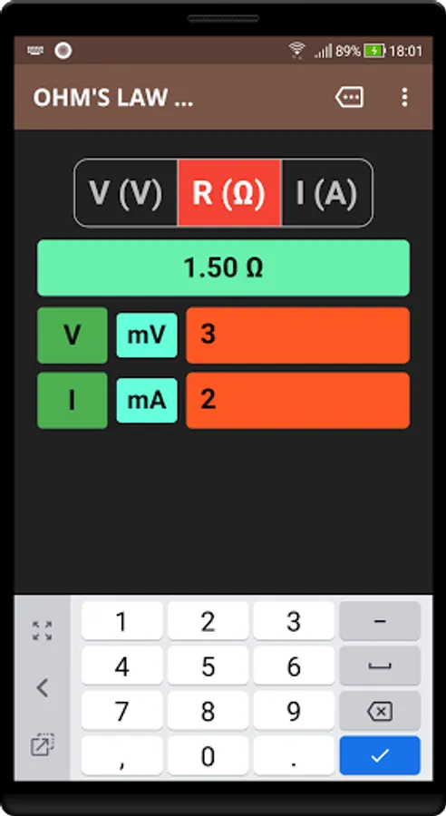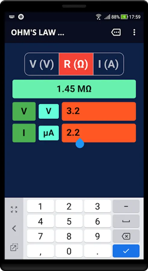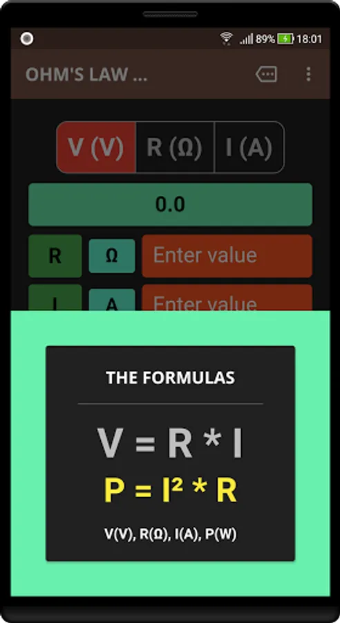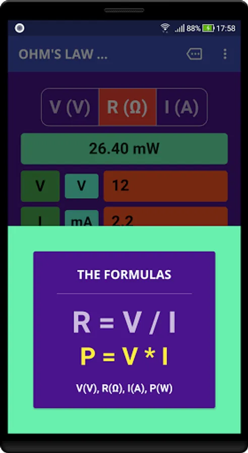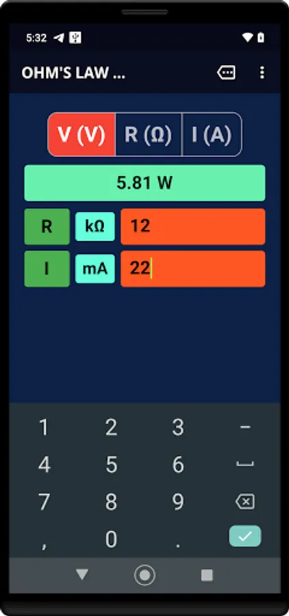 Ohm's Law Calculator works in real-time. Results are calculated as you type-in your values. The App also calculates power-values(W) for any given combination of voltage(V), current(I) and resistance(R). Just tap on the result bar to show or hide the calculated power values.