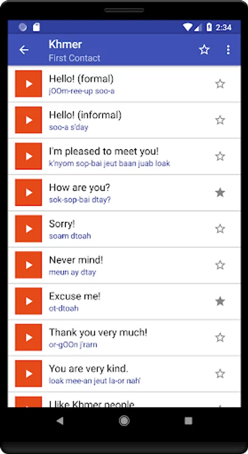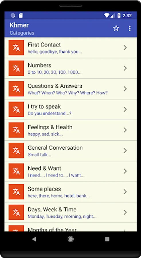 - Phrases and words are grouped into 12 categories like First Contact, General Conversation etc.