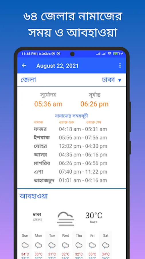 Bangla Calendar Plus also gives you information about the season. You can know the sunrise sunset and weather with Bangla Calendar Plus. It has a beautiful home screen with live time with seconds and dates in Bangla, English, and Arabic.
