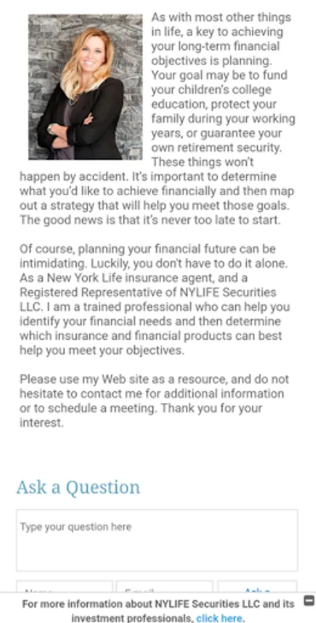 Of course, planning your financial future can be intimidating. Luckily, you don't have to do it alone. As a New York Life insurance agent, and a Registered Representative of NYLIFE Securities LLC. I am a trained professional who can help you identify your financial needs and then determine which insurance and financial products can best help you meet your objectives.
