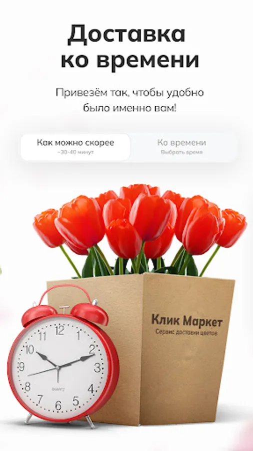 With the help of filters, you can find certain varieties or types of flowers in one click. Roses, tulips, chrysanthemums - Click Market has bouquets for any occasion.