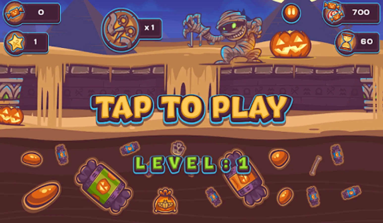 The objective of the game is to gather every one of the confections and candies for the mummy, likewise be careful with touchy pumpkins, you can improve your accomplishments with the assistance of shopping in the store. Mummy Games This game has 20 levels with a step by step expanding level of unpredictability, and the game is unmistakably appropriate for cell phones.