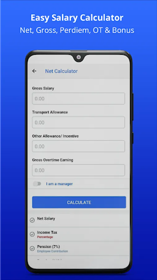 • Net Salary Calculation from gross earning, transport allowance, other allowance and incentives and overtime