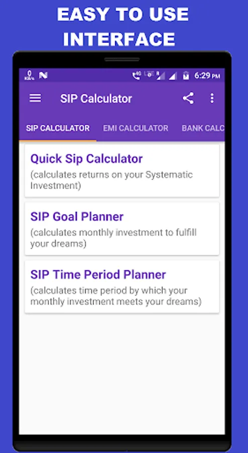 SIP Calculator / SIP Planner is all in one financial calculator . It gives detailed analysis for SIP investments. You can plan your SIP Investments with this simple SIP Planner. This investment planner app also has Banking Calculator for FD and RD calculations. EMI calculator helps you to plan your loan installments.