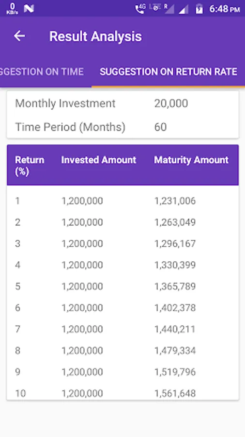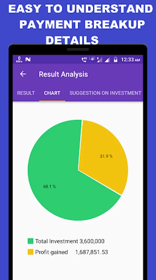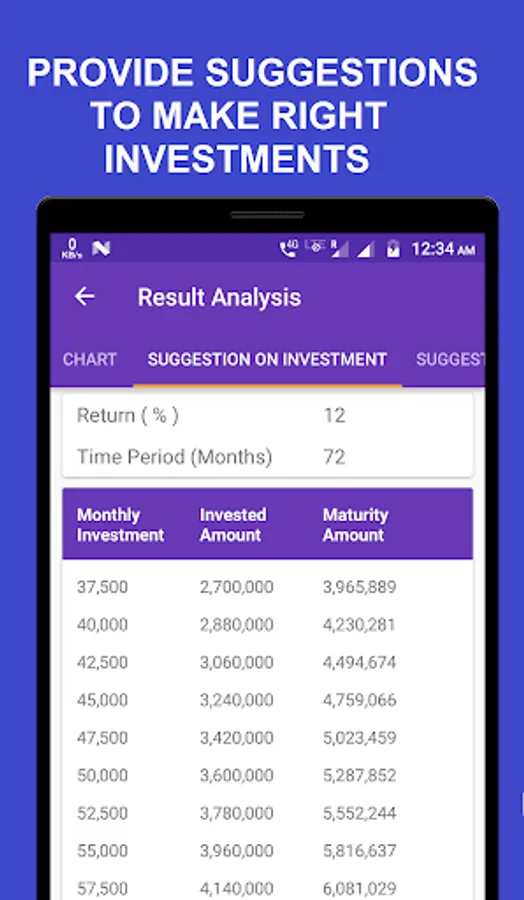 Suggestion on investments , return rate , time period helps do financial planning easily. Detailed result analysis with charts and graphs for easy understanding.