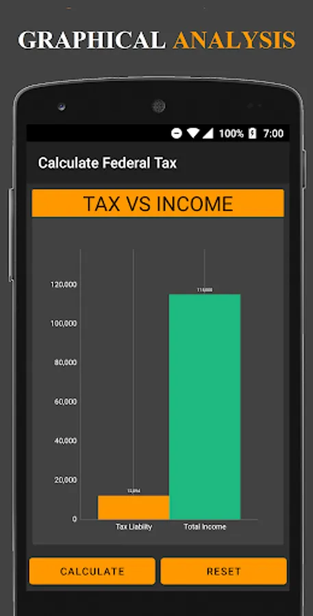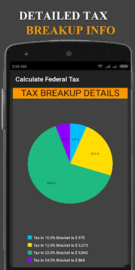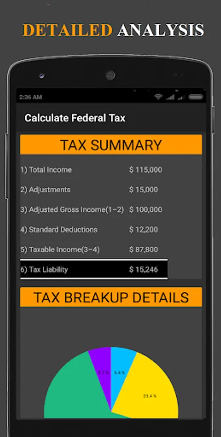 Federal Tax Calculator shows detailed graphical analysis along with tax breakup details after computing Income Tax.
