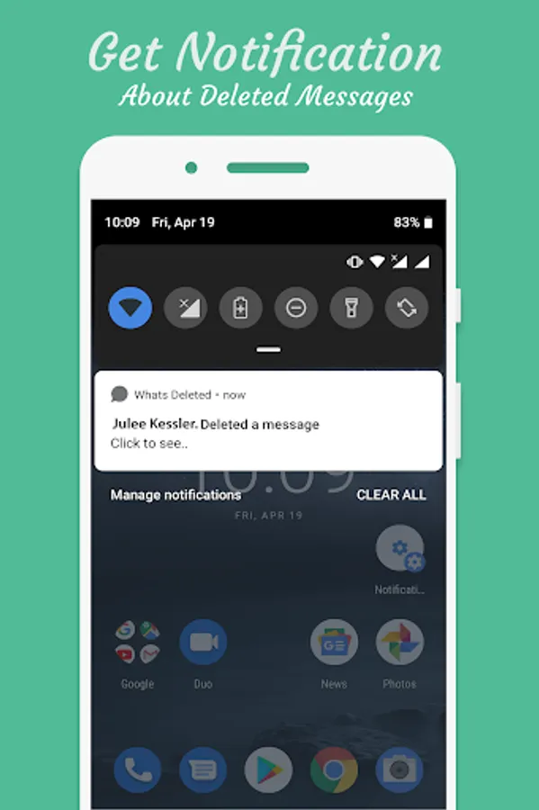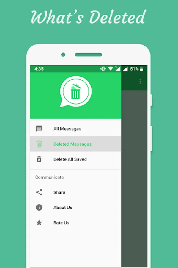 What’s Deleted is a smart tool to sneak through the deleted messages from Whatsapp chat. The app remains active in the background and keeps a strong check of your whatsapp notifications of received messages. Once the user removes any message, the app automatically alerts you that the message is removed. And you will be able to read it in the What’s Deleted message section.