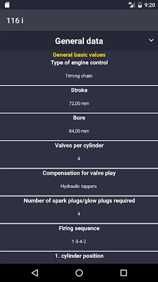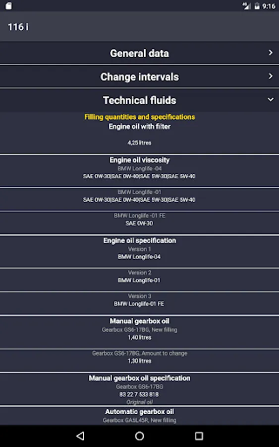 Data is divided into categories: general information, chassis, tightening torques of bolts and nuts, fuel system, brake system, lighting lamps, a replacement intervals and volumes of technical fluids.