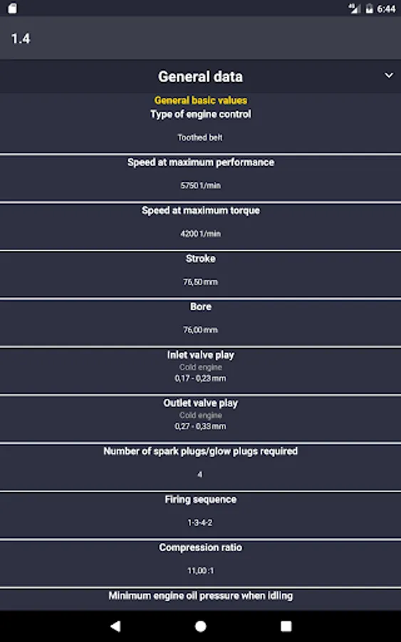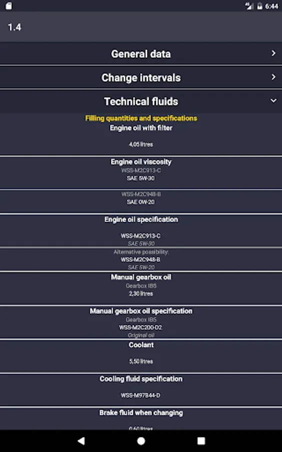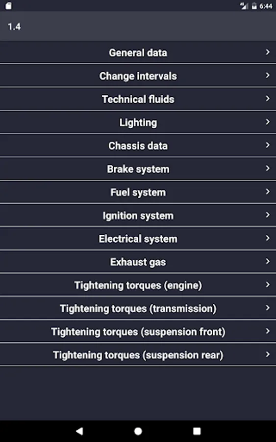 Data is divided into categories: general information, chassis, tightening torques of bolts and nuts, fuel system, brake system, lighting lamps, a replacement intervals and volumes of technical fluids.