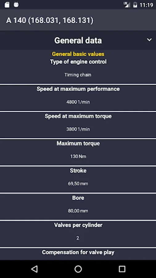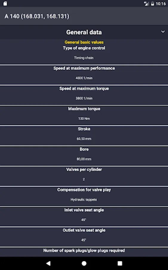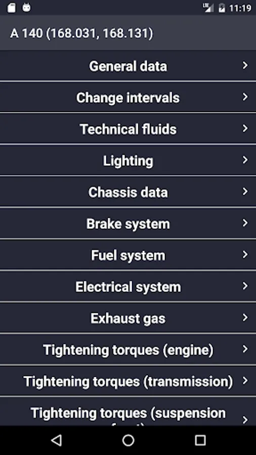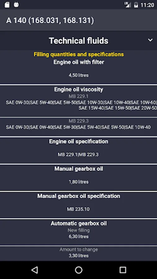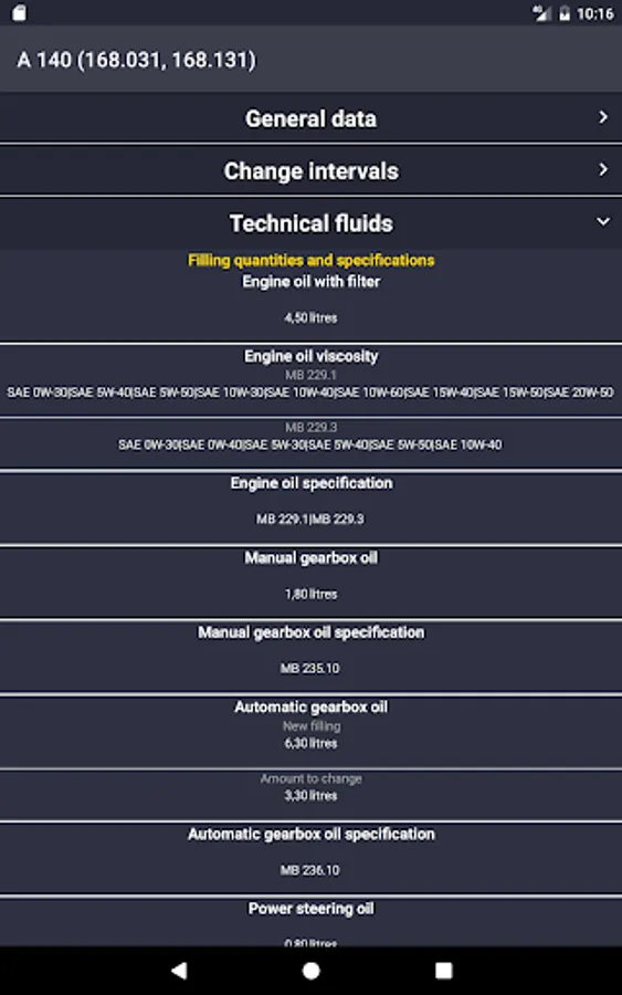 Data is divided into categories: general information, chassis, tightening torques of bolts and nuts, fuel system, brake system, lighting lamps, a replacement intervals and volumes of technical fluids.