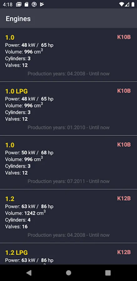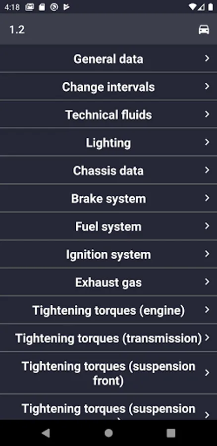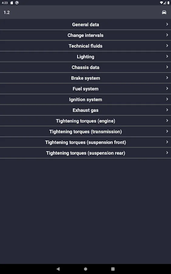 Data is divided into categories: general information, chassis, tightening torques of bolts and nuts, fuel system, brake system, lighting lamps, a replacement intervals and volumes of technical fluids.