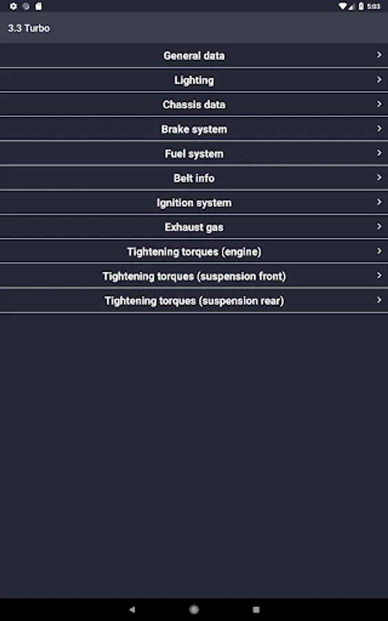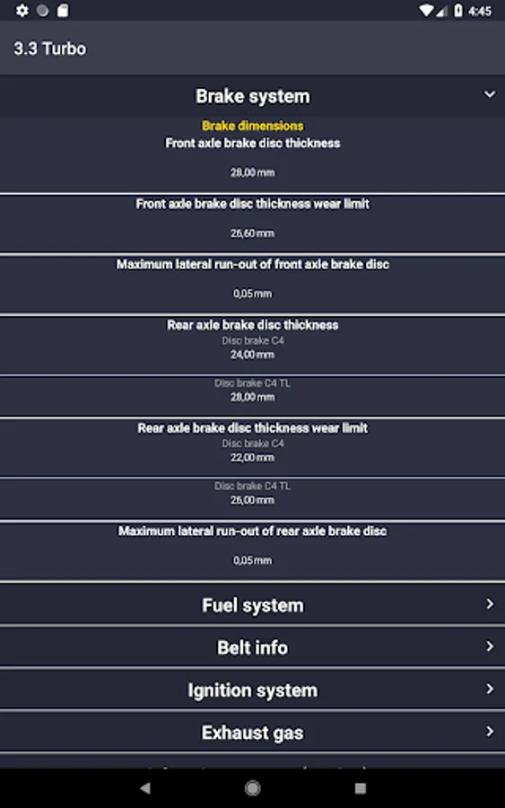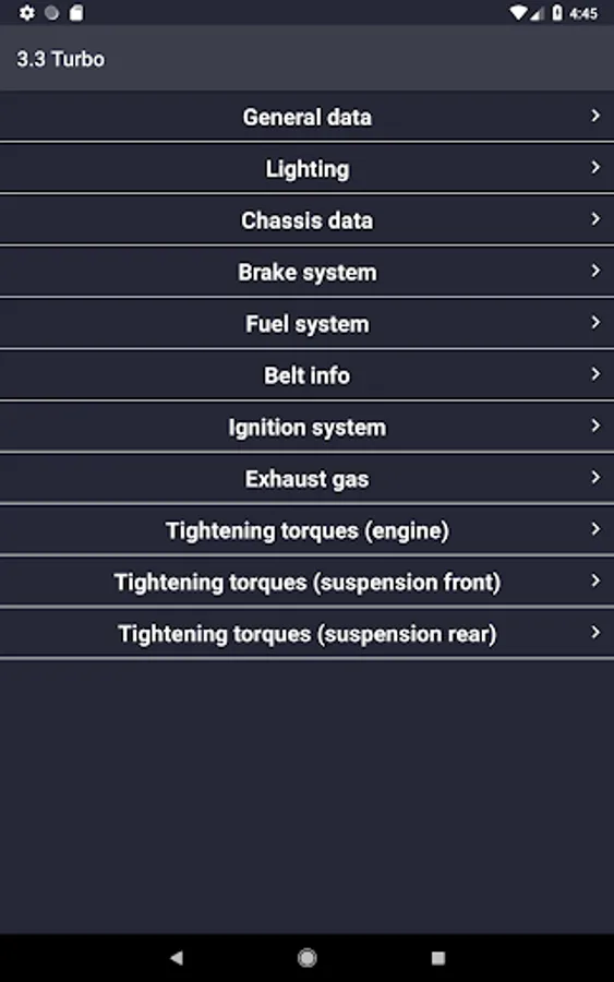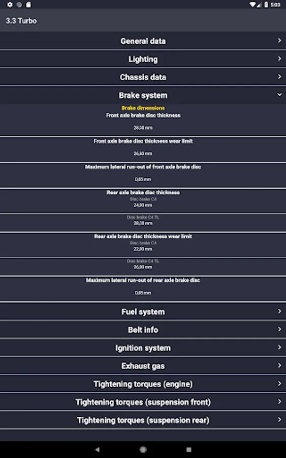 Data is divided into categories: general information, chassis, tightening torques of bolts and nuts, fuel system, brake system, lighting lamps, a replacement intervals and volumes of technical fluids.