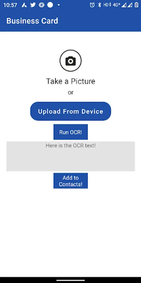 Business Card Scanner Application is an Easy and fast to store Business cards. It fetch card data like name, Phone number, email and it can be store to contacts.