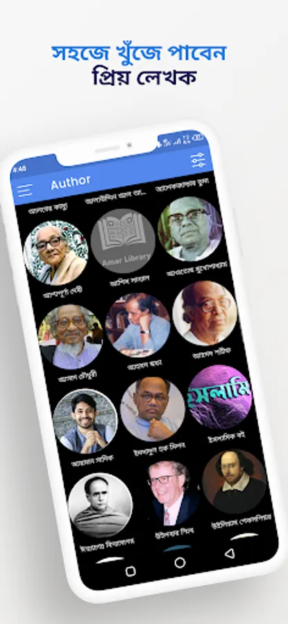 We have Humayun Ahmed, Muhammad Zafar Iqbal, Selina Hossain, Rakib Hasan, Ahsan Habib, Anisul Hoq, Nirmolendu, Shamsul Haque, Hasan Azizul Haque, Anish Das Apu, Shirshendu, Sunil, Samaresh, Shibram, Sanjib, Iftekhar Amin, Shykh Seraj, Arundhati Roy.