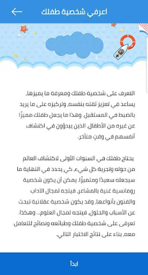 My child application is an easy and simple application that helps you to recognize your child's personality and suggests appropriate tips to deal with him.