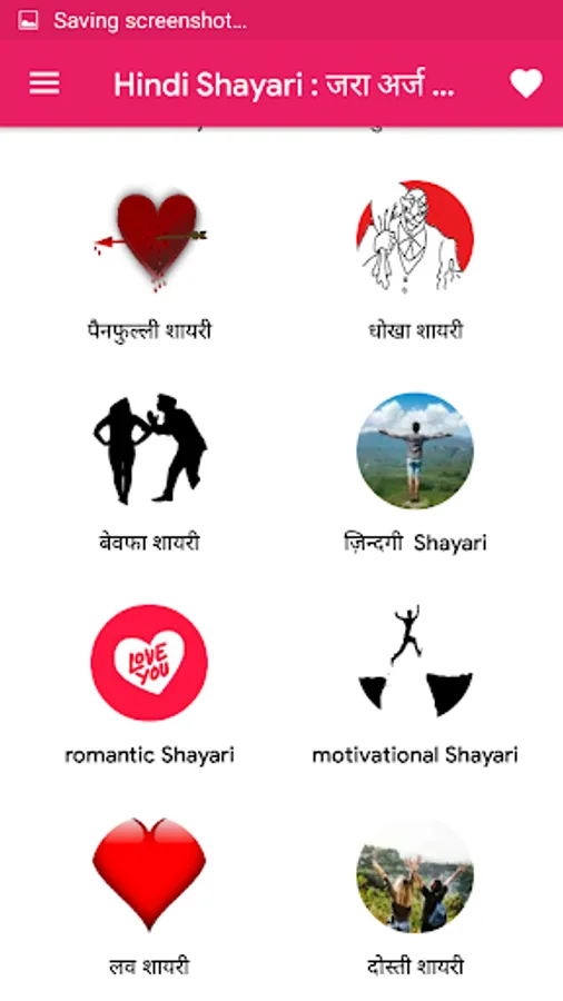 Romantic Shayari, Dil Shayari, Motivational Shayari in hindi. Many categories dedicated to those who wants to express feelings in words such as Mausam, , Dard, Funny, Hindi, Romantic, Dhoka, Pyar, Ishq, Ansoo, Tanhai