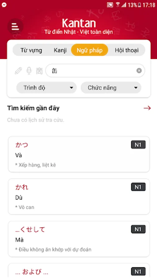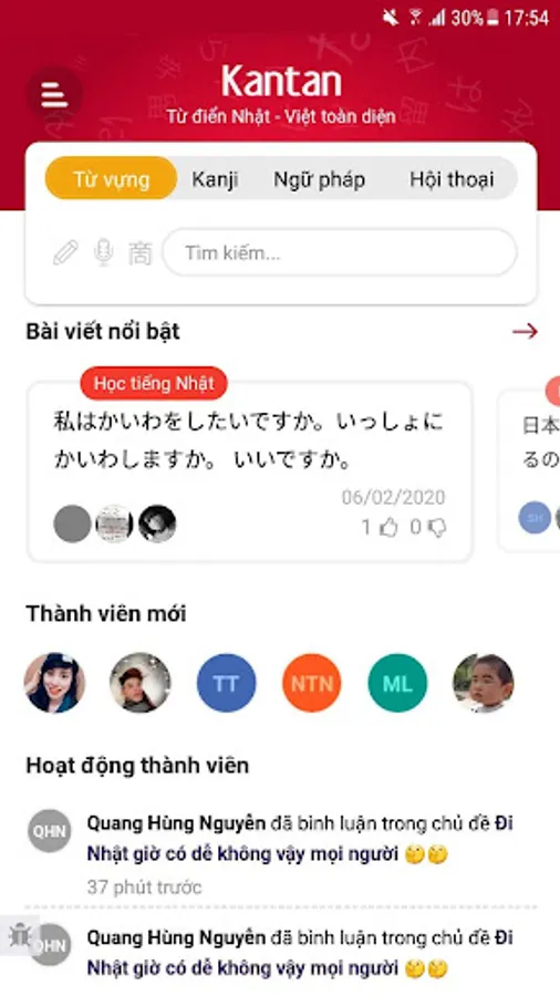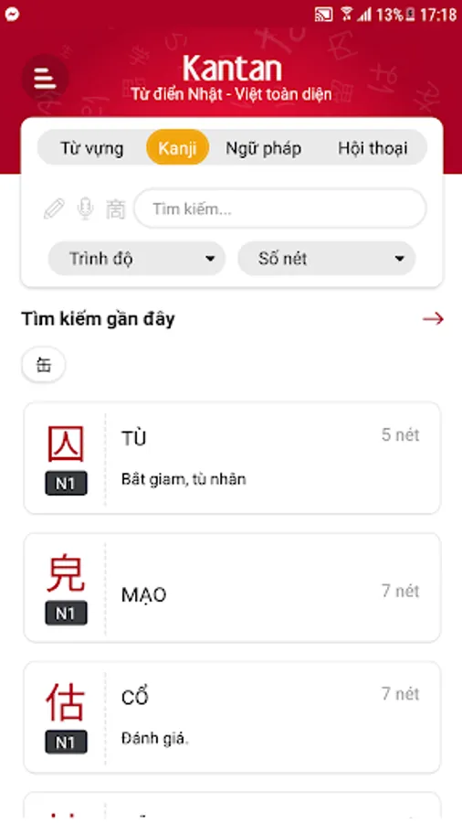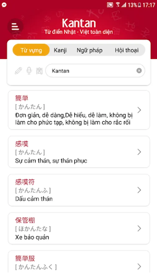 Kantan is a powerful and intelligent Japanese - Vietnamese dictionary application. It allows you to find Japanese - Vietnamese or Vietnamese - Japanese bilingual words, Chinese characters, example sentences, grammar, and grammar usage more quickly and easily than all other applications.