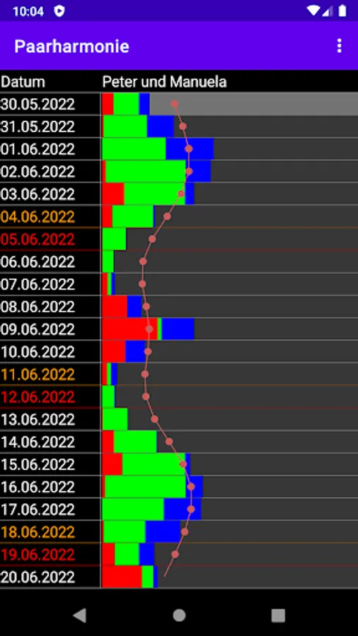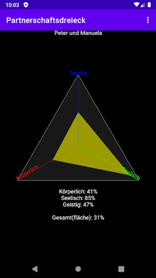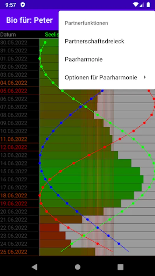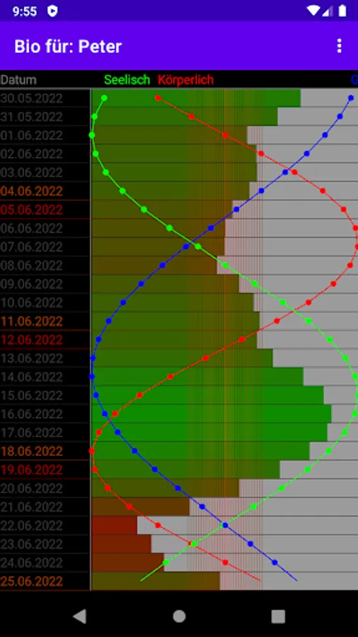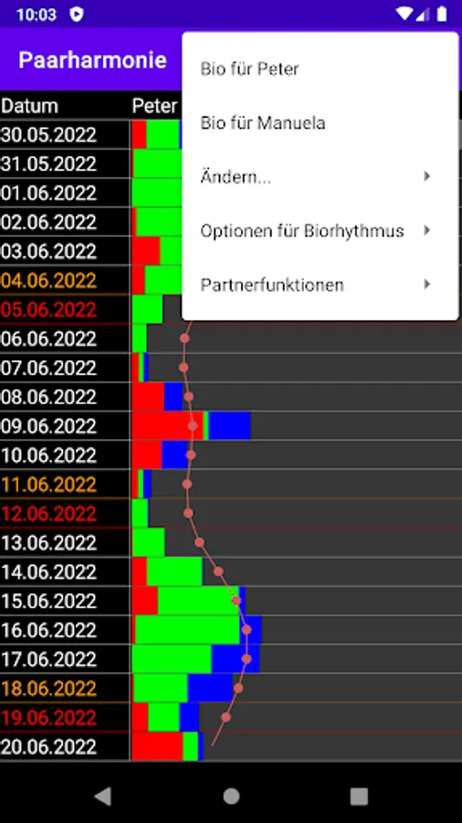 With this application you can look at your biorhythm (and that of a second person) comfortably and easily. If there is a second entry, you can look at the partnership triangle (the agreement) and a couple harmony.