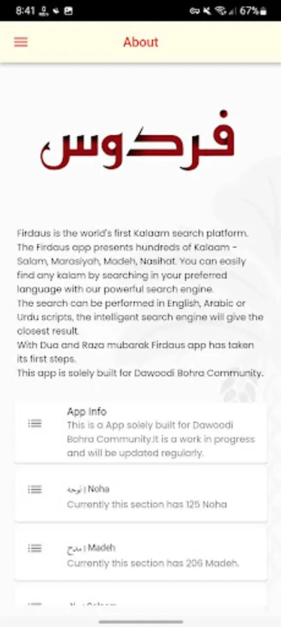 Firdaus App is an app for the Mumineen all around the world to easily access hundreds of Kalam in just one click.