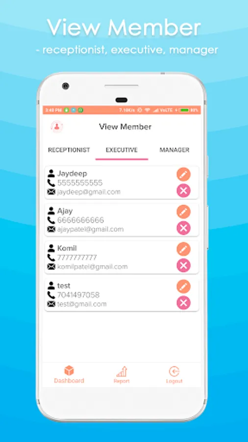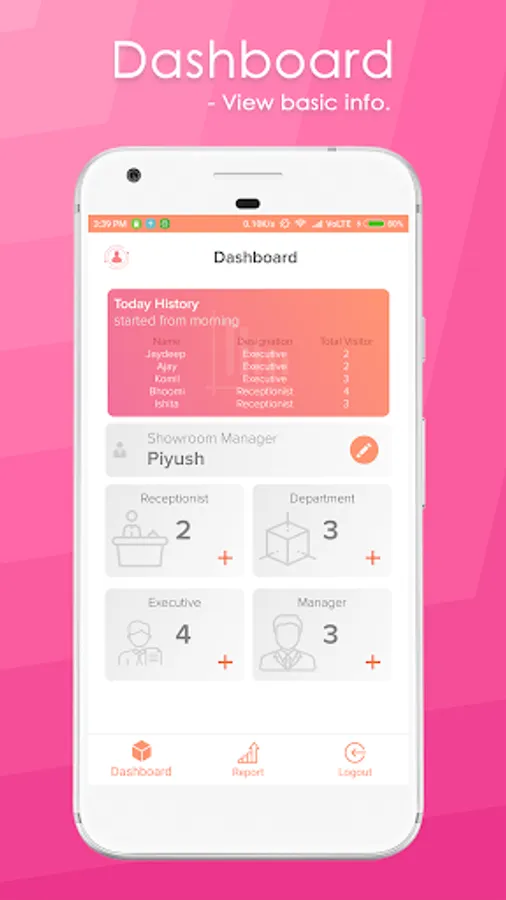 The Department Manager will Get it's under executive report. manager also get their Executive performance. Executive attend their visitor arrives if the executive does not Attend visitor then after 30 minute notifies the Manager.