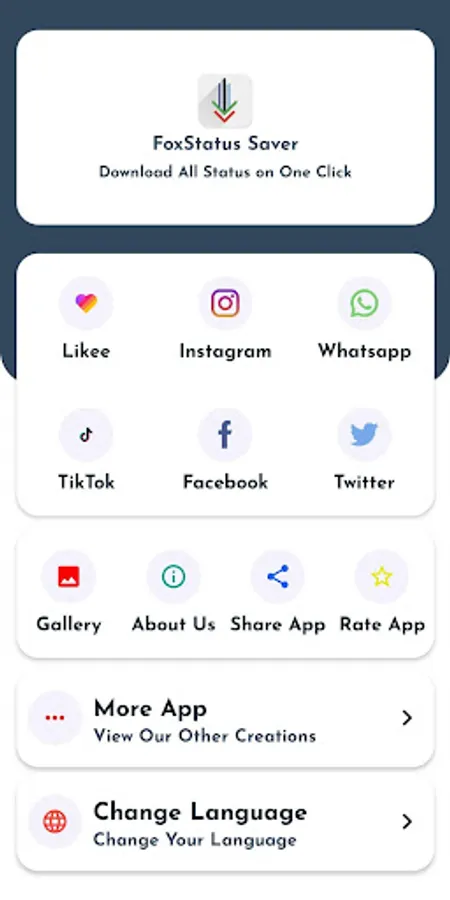 FoxStatus Saver is an Android Social Media Video and Image Downloader App. You can Save Likee, WhatsApp, WhatsApp Business, TikTok, Twitter, and Instagram Videos and Images, Reel with FoxStatus Saver. You can Download Likee and Tiktok Video Without Watermark. You can easily share them from the App. More Features are Available in the App, Download the App and see all the features