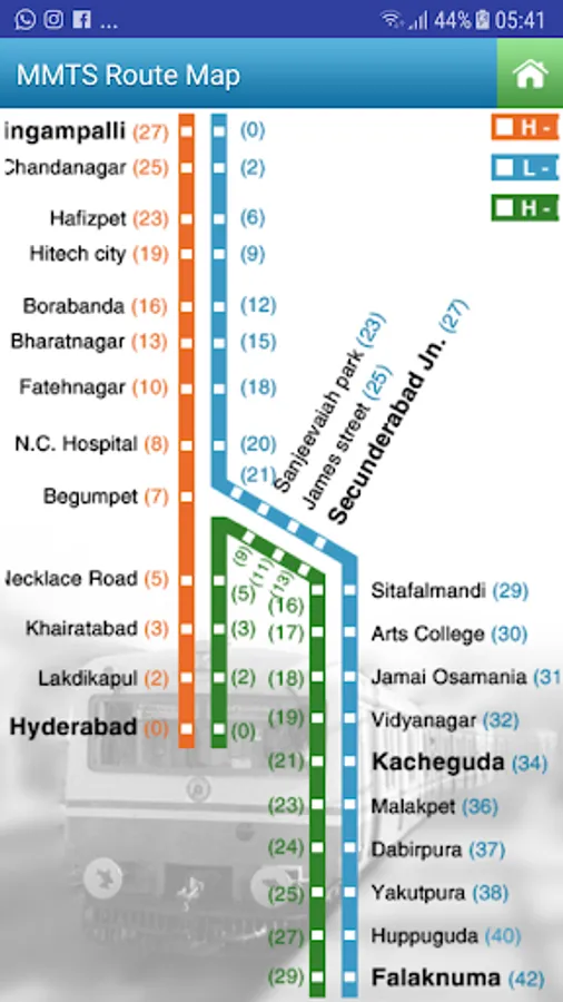 Complete route map of the MMTS Train Stations in the twin cities is shown.
